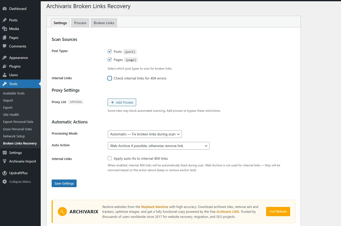 Автоматический режим подходит для больших сайтов, где проверять каждую ссылку вручную непрактично. Плагин автоматически заменяет битые ссылки копиями из Wayback Machine. Если архивная копия недоступна, гиперссылка удаляется, а текст анкора остаётся видимым.