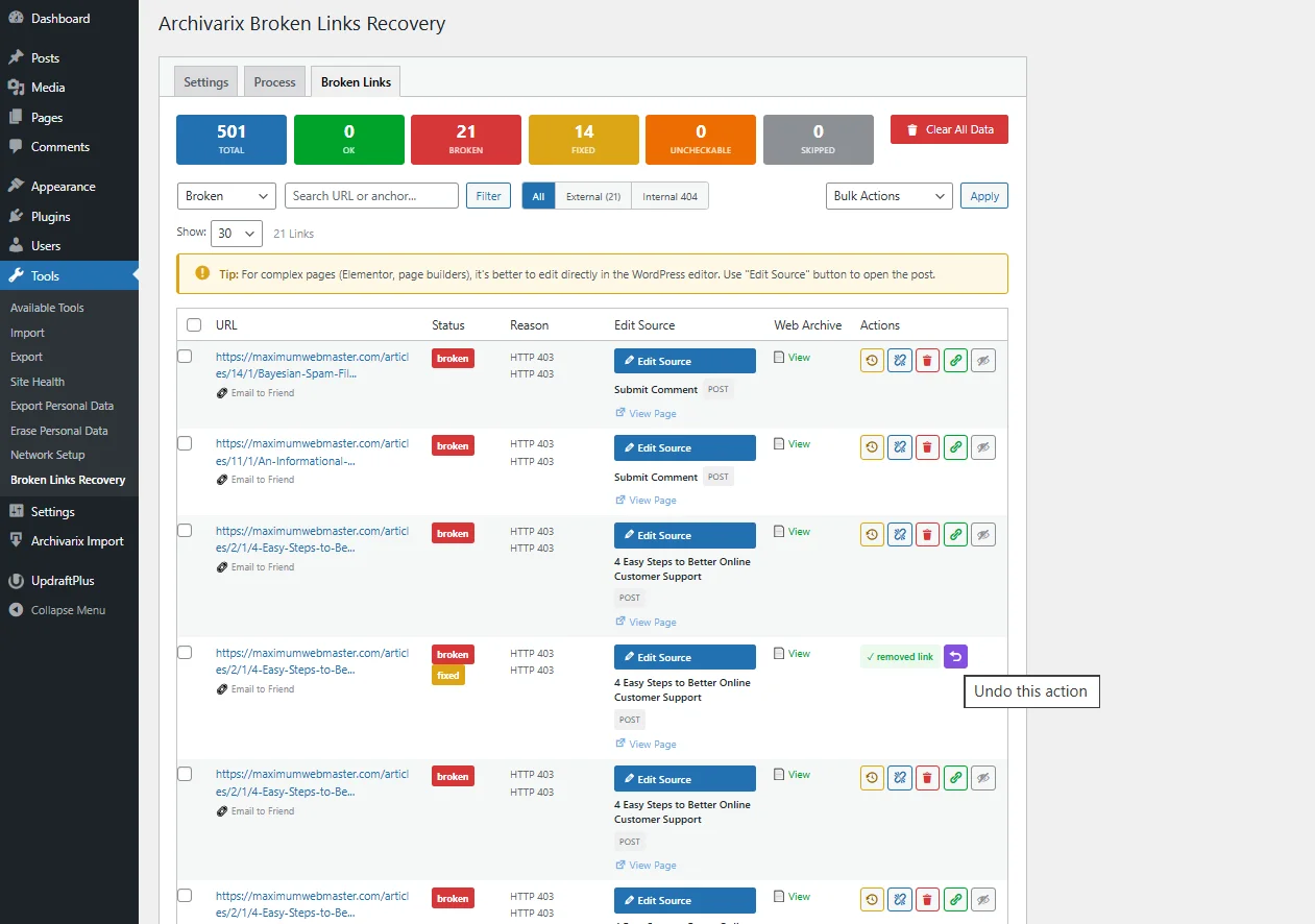 Ручной режим даёт полный контроль. Во вкладке Broken Links можно просмотреть каждую битую ссылку и выбрать действие:
