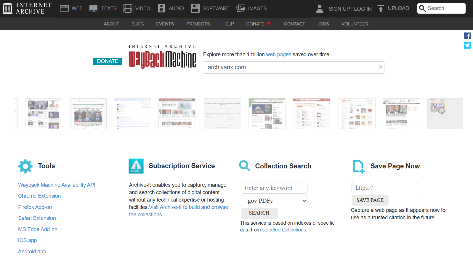 Archive-It. Это платная подписная служба, через которую библиотеки, университеты, государственные учреждения и другие организации заказывают регулярное сканирование определённых сайтов или коллекций. Archive-It позволяет настраивать, что именно сканировать и с какой частотой. Результаты попадают в Wayback Machine. Именно через Archive-It сохраняются многие правительственные сайты, особенно в периоды смены администраций.